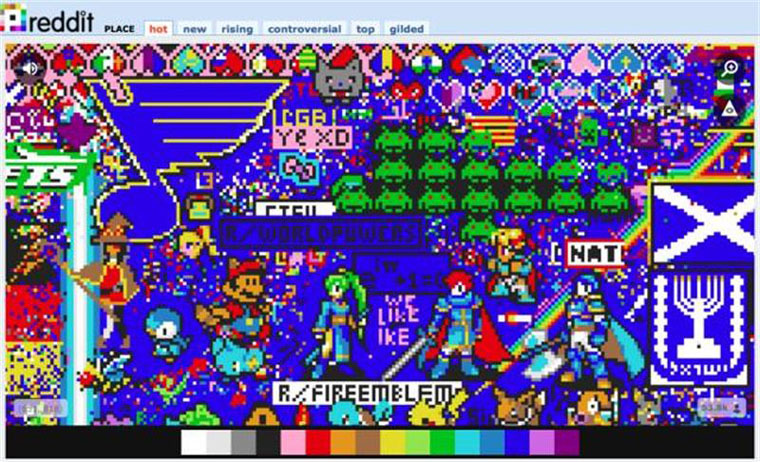 這有點像今年的愚人節(jié)Reddit推出的一個活動,讓世界各地的網(wǎng)友為空白畫布著色。