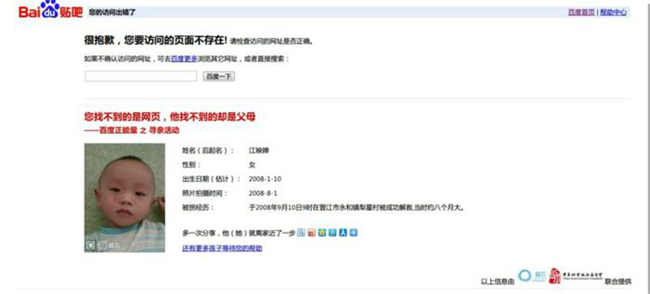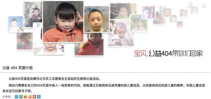 騰訊,百度和網(wǎng)易的“404頁”都缺少兒童信息。 這404頁面允許用戶在404頁面中嵌入一個簡單的代碼。 通過此頁面顯示失蹤兒童的信息,反映公司對公益的態(tài)度。。