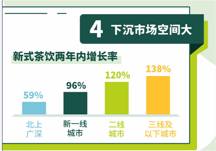 美團數據顯示,新式茶飲在北上廣深、新一線城市、二線城市和三線及以下城市兩年內增長率分別是59%、96%、120%和138%。
