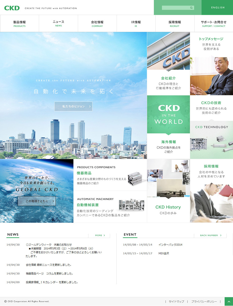 這是一家日本商業機械網頁設計,采用logo綠色,并在底部設置返回頭部的按鈕,是一個非常好用戶體驗的設計。
