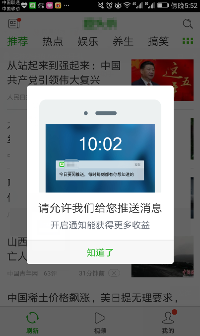 到達率很關鍵,如果你選取的推送工具沒有保障,或者就是達到率不高的話,就欲哭無淚了。比如之前我們家產(chǎn)品股事匯用的第三方工具,那個達到率可謂是讓人想砸掉后臺啊,到達率不到三分一,特別是安卓,因為安卓的多樣性(各個安卓手機大佬們能不能組成一個安卓聯(lián)盟啊)那個成功率低的可憐,而有些手機是自動屏蔽掉信息的推送的,所以到達率就更加低了。ios可能還好點,現(xiàn)在很多app在打開后都會自動友好提醒用戶打開消息推送,比如下圖。所以這個達到率問題,只有兩個解決辦法,要不然就是換個貴一點的,可能會好點,要不然自己開發(fā)后臺,但是成功是個問題,能不能說服你家boss就靠你的忽悠了。