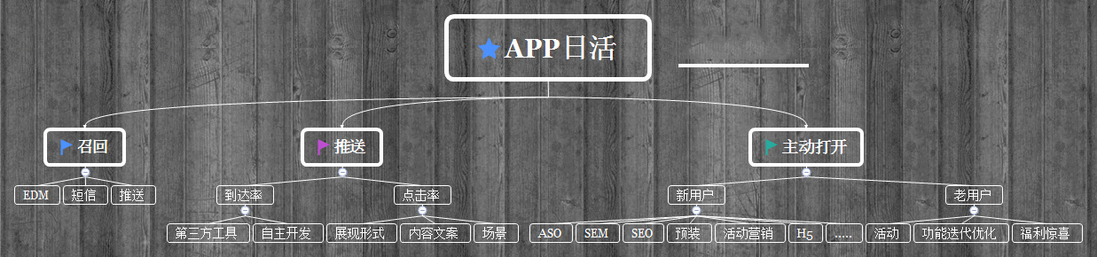 好了,上面是基于一個用戶的日活,然后羅列出影響日活的一些因素,但最這些因素進行細分,最后各個擊破,這就有一個清晰的邏輯順序,什么時候做什么,以及要做哪些事情都會比較清楚。做產(chǎn)品運營或者app推廣,就怕就是一團糟,就是腦子的思維線索就是一捆線,哪個是線頭都找不到,那就麻煩了。