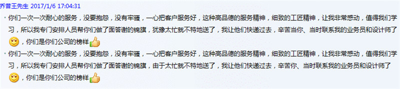 客戶一片熱忱,我們給他幫到了些許小忙,我們做了應該做的事情,并且讓這個事情的執行過程中,所有的參與人都能保持一個愉快的心情,直至項目完成。這是一件不容易的事情,但需要用一個平實的心態去看待,難道我們不應該每一個項目都這樣做嗎?是的,每一個項目都應該像這樣去做。那么獎勵,或者說客戶的高度評價,固然能夠給予我們成就感和滿足感,但更應該以平常心去對待。謝謝喬昔,謝謝喬昔的王先生!