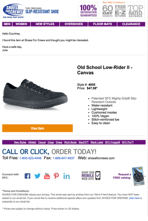 如防滑鞋品牌Crews 根據其產品特性瞄準對口需求的行業精準人群,通過他們去分享給有同樣防滑需求的人群。與此同時,結合郵件營銷,一旦用戶產生分享行為,隨即觸發一封個性化郵件給被分享用戶,除了以分享用戶口吻問候外,外加產品的相關信息及相應的轉化按鈕,環環相扣,一步提升用戶品牌黏性。