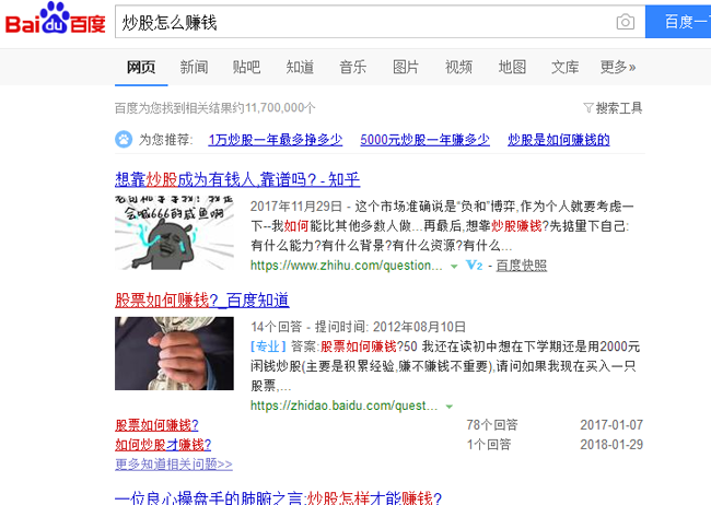 比如創(chuàng)新互聯(lián)將這個(gè)網(wǎng)頁標(biāo)題進(jìn)行改版,改版后的標(biāo)題如:炒股怎么賺錢?7種適合新手炒股賺錢的方法!-XX平臺(tái)。像改版后的標(biāo)題,可以直接打通小白用戶的最終防線,這個(gè)防線有兩種技巧,第一、突顯出用戶的價(jià)值觀,這個(gè)價(jià)值觀在標(biāo)題里面已經(jīng)用新手二字體現(xiàn)出來,告知了用戶的一種心理暗示,原來這個(gè)網(wǎng)頁內(nèi)容就是為我自己寫的。第二,強(qiáng)調(diào)一個(gè)問題的結(jié)果,前者是提問,后者則是答案,但是同樣也要把前面所講的懸念感帶進(jìn)去,7種賺錢方法?哪7種?我們不妨看看該關(guān)鍵詞百度首頁排名的網(wǎng)頁標(biāo)題如下圖所示: