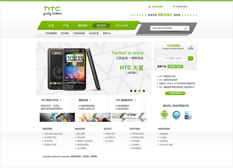 Banner下方的分欄信息部分,我們分別放置了手機配件、HTC如影攝像頭、免費更換服務三個信息欄目,為了讓分欄信息的排版不過于單調,我們將本來的四欄布局更改為三欄布局,將中間欄目的寬度放大,這樣在版式上有所變化,看上去更靈活一些。分欄信息的設計創意全部來自于HTC現有的網站,這里我們不做另外的創意。分欄信息部分的色彩我們通過調整圖片的顏色,保持了以綠色為主色調,輔以灰色搭配的方法,這符合我們本來在頁面色彩方案上的想法。