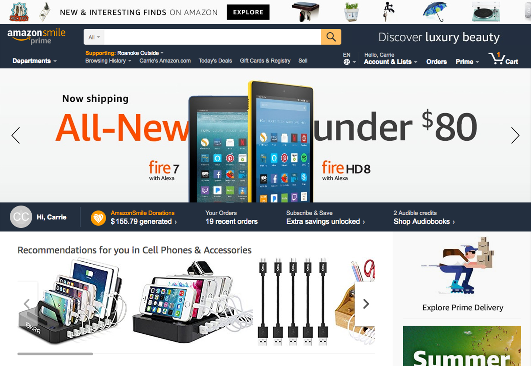 在這個(gè)用戶體驗(yàn)高度個(gè)性化的時(shí)代,網(wǎng)頁(yè)導(dǎo)航的玩法可以更加多樣。以Amazon 為例,當(dāng)你登錄了之后,會(huì)發(fā)現(xiàn)導(dǎo)航開(kāi)始圍繞著你的信息進(jìn)行了調(diào)整,導(dǎo)航欄從通用的條目變?yōu)楦N近你的個(gè)人情況的樣式,其中包括最近的購(gòu)買(mǎi)記錄,信用額度和Amazon 的服務(wù)信息等。