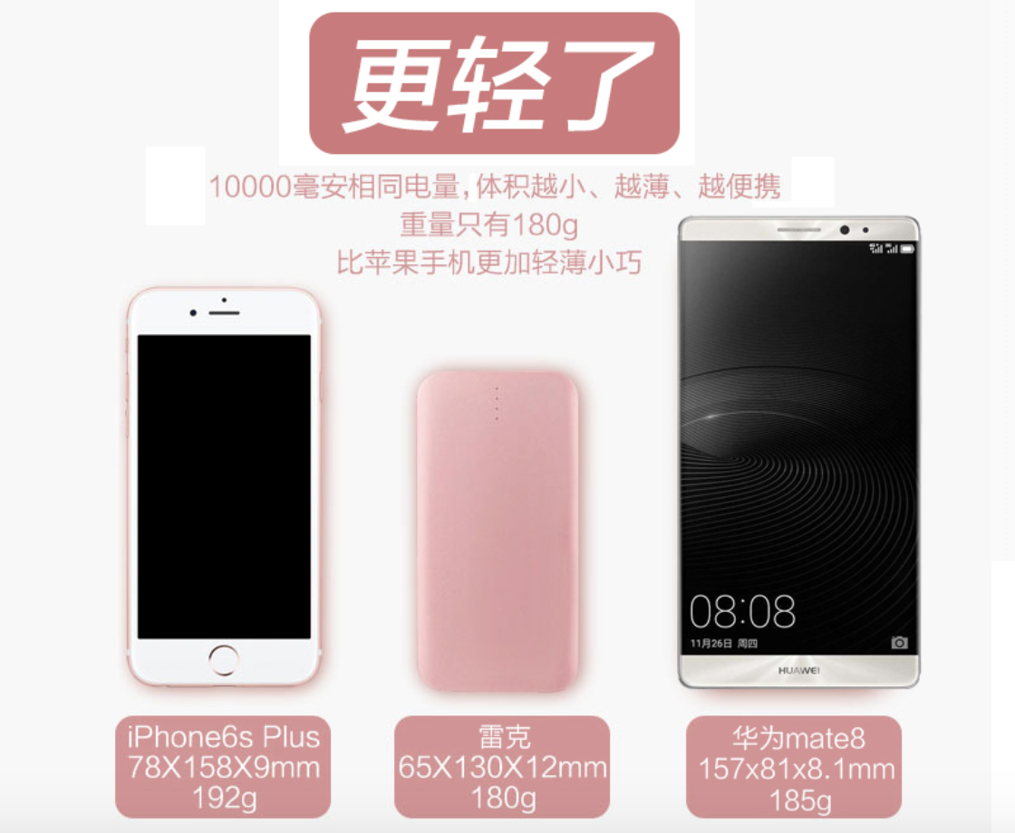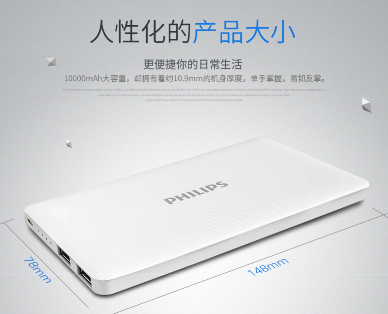 便攜式充電寶,為了體現便攜體現小,一般會使用如下配圖,詳細標注充電寶的尺寸。