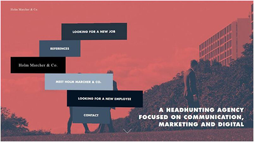 雙色調顏色的選擇并不會使文本變得十分明顯,而是以一種更溫和卻足以為目標服務的形式表現出來。Holm Marcher & Co.公司做的這個珊瑚藍雙色很有趣,而且創造了文字高度可讀的背景。另外,導航元素使用的藍色色調使畫面變得更有活力了。
