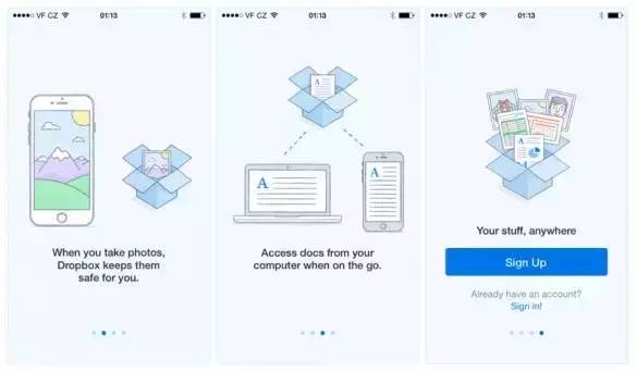 分步導航也可以用來引導用戶了解一個應用或服務的功能。如果步驟不多,也可以使用小圓點來表示(就像下圖Dropbox的例子)。