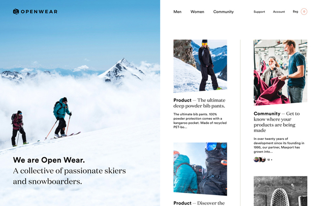 Open Wear本網(wǎng)站設(shè)計(jì)還采用了分屏布局,但內(nèi)容兩側(cè)的內(nèi)容并不相同,這種不對(duì)稱性可以讓用戶更自然地瀏覽正確的內(nèi)容頁(yè)面。