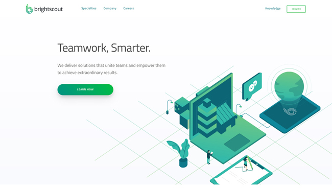 Brightscout該網(wǎng)站的設(shè)計(jì)第一個(gè)屏幕使用了一個(gè)微妙而有趣的對(duì)角布局。 圖片和文字描述分布在整個(gè)網(wǎng)站上。 這種拼湊布局給人一種開放的感覺。 在滾動(dòng)過程中,放大運(yùn)動(dòng)效果會(huì)使人無(wú)法停止?jié)L動(dòng)。 該頁(yè)面最終被引導(dǎo)至CTA按鈕,該功能是顯而易見的。