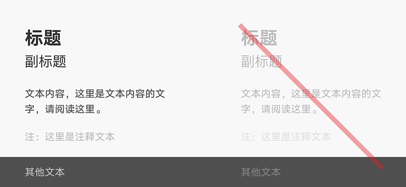 通常情況下,文本和背景盡量避免使用相同或相似的顏色。文本越明顯,用戶能夠掃描和閱讀的速度越快。當然,學會通過文本顏色、大小和背景的顏色關系來控制視覺層級也是必要的。