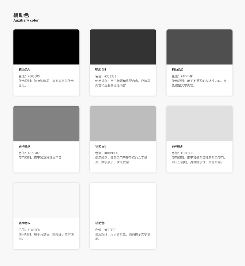 灰色通常作為輔助色使用,根據之前的項目經驗,給大家分享一套我自己一直在使用的灰色,灰的有層次,清晰的區分信息層級是必要的
