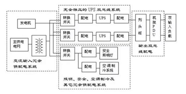 3、 為了使數據中心的電力持續供應,需使用兩套獨立的UPS供電系統,來保證數據中心的供電,即UPS系統需達到:2N或M(N+1) 冗余 (M=2,3, 4……)的要求;