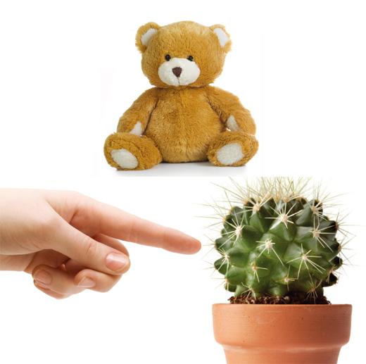 看到這只毛絨絨的泰迪熊,是否讓你有一種溫馨及舒服的感覺?看到手指離仙人掌這么近,是否讓你有一種想立即將手抽回的感覺?這就是同型效應。我們對這些圖片產生反應,是根據我們自身曾經有過的經驗而作出的,因為我們曾親身觸摸過一個真實的泰迪熊,我們也曾經有過被一根針刺過產生疼痛的經歷――我們將已有的一種感覺應用到對一張圖片的理解上。