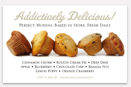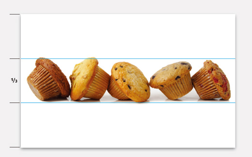 圖片占據版面的1/3高是恰當的,中間的位置也是版面中最有力量的區域,能夠大程度吸引別人的興趣。留意松餅的陰影及倒影使松屏象放置在名片上,有很強的真實感,一如你那些放在餐臺上的松餅一樣。