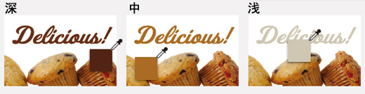 從圖片取色:從左到右,文字有深中淺三色選擇,這些標題顏色都是用吸管工具從圖片選取的顏色,這三種顏色都能夠與圖片形成良好的搭配,但最淺的顏色可以讓那些松餅顯得更加突出及吸引。