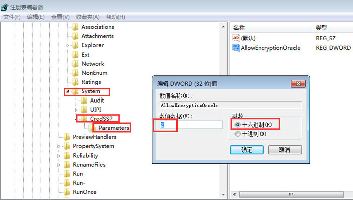4)在Parameters文件夾下,新建 DWORD(32)位值(D),基數選擇16進制(H),文件名為 AllowEncryptionOracle 值為2
