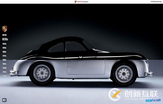在上面 Porsche Evolution 這個網站當中,不同時代的保時捷車型隨著時間的變化而展現,背景的圖片場景也隨之變化,如果你仔細聽會發現音樂也會隨著年代的變化而演變。