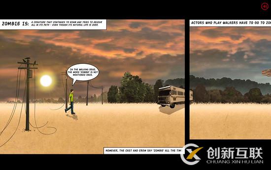 和其他的視差滾動的網頁設計不同,The Walking Dead Zombiefied 的頁面布局是橫向的,當用戶滾動頁面的時候,角色會隨著滾動,穿過不同的場景,劇情也隨之發展,頗為有趣。