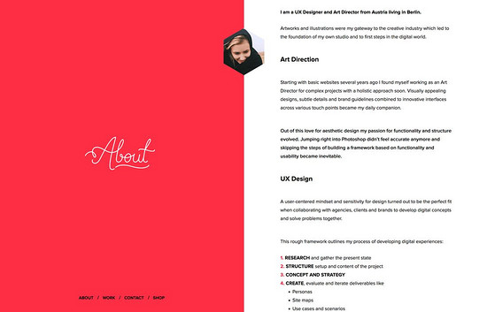 Melanie David 的這個個人頁面采用了單頁設計,她將頁面的一半用作導航,當你滾動的時候,頁面的一側不動,另一側會正常滾動,當你完成閱讀之后,會自然切換到下一個內容區塊。