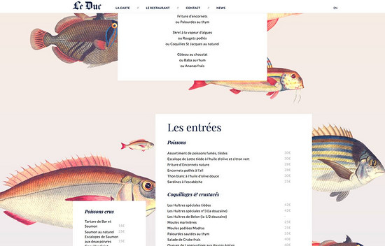 Le Duc 餐廳的網頁當中,設計師按照你的閱讀習慣和訂餐的方式,將菜單劃分為單獨的區塊。動畫很簡單,背景的魚起到了很好的裝飾性作用,用戶在瀏覽的時候,能夠更好地了解訂餐的信息。