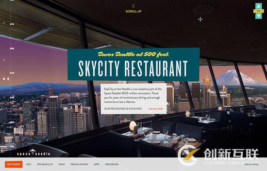 而 Seattle Space Needle 的視差特效則采用的是更為經典的設計,當用戶在瀏覽的時候會因為元素間不同的運動速度而產生擬真的瀏覽體驗。不過,這個網站的獨特之處在于,它是從下往上瀏覽的,非常有意思。當用戶通過網站的不同區塊到達頂端的餐廳區域的時候,會感受到這個餐廳所處的位置之高,城市的天際線和CTA元素結合到一起,讓你不會錯過關鍵的信息。這樣的設計是教育性的,也是冒險的,但是它確實創造了前所未有的體驗,令人難忘。