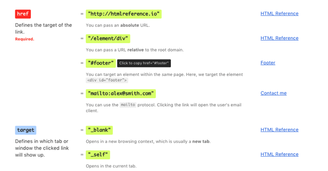 回到 HTML Reference 首頁,前面有提到首頁列出所有 HTML 語法卷標,依照字母排列,當然用戶也能透過搜尋功能來快速查找,例如下圖是 a 也就是超鏈結語法的使用教學,可以看到目標鏈結(href)參數是必須,網站還列出幾種不同的寫法和用法。
