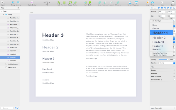在像Sketch這樣的程序中,你可以創建共享的文本樣式,以便快速插入已經從準則中應用的樣式文本。