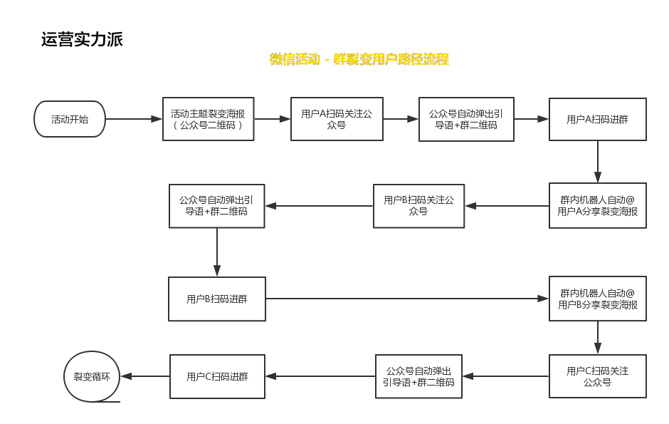 用戶路徑:裂變海報(活動母碼)推送給用戶,用戶掃碼后關注公眾號并會收到進群引導&群二維碼,用戶掃碼會隨機匹配到活動群,進群后群內機器人@用戶并引導用戶分享活動海報,用戶分享后即可領取相應獎勵,同時活動迅速在好友關系中裂變開。