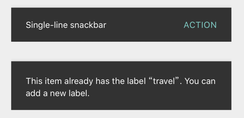 Only one snackbar may be displayed at a time. Each snackbar may contain a single action, neither of which may be “Dismiss” or “Cancel.”