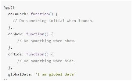 其中onLaunch,onShow,onHide用于響應生命周期回掉,也可自定義全局變量及方法。