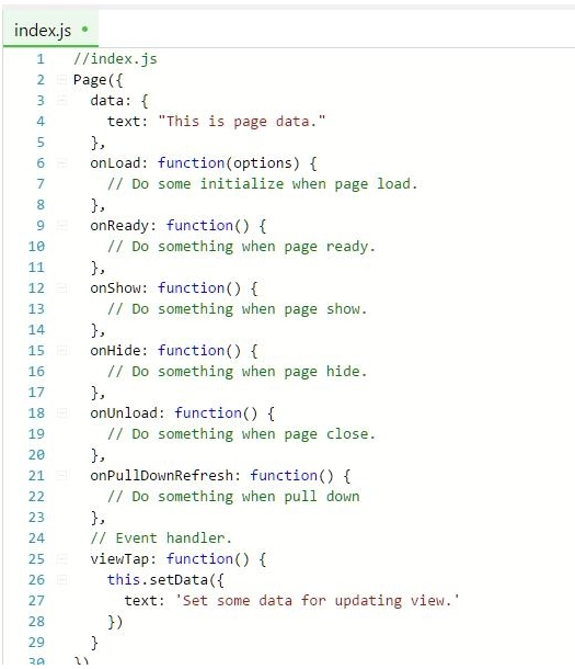 如果說上面的只是對整個小程序的配置注冊,這里的具體的頁面操作才是和用戶交互的真正載體,每個頁面都可單獨存放一個文件夾,方便管理,同時WAService會將此文件夾中的頁面樣式文件進行渲染。每個頁面都由js文件進行控制,wxml進行布局,wxss就是樣式設置了。用于響應生命周期方法有onLoad(監(jiān)聽頁面加載),onReady(監(jiān)聽頁面初次渲染完成),onShow(監(jiān)聽頁面顯示),onHide(監(jiān)聽頁面隱藏),onUnload(監(jiān)聽頁面卸載),示例如下:
